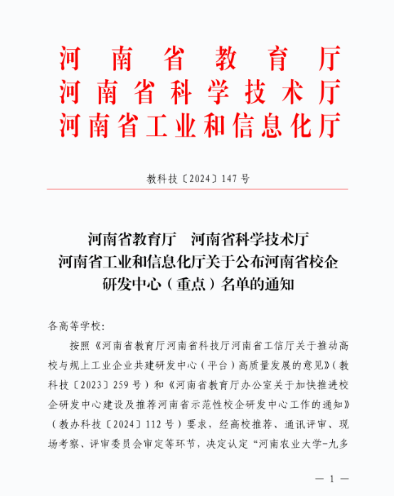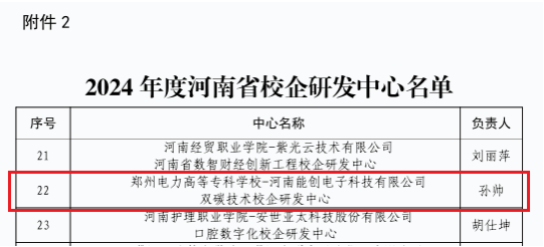 近日,河南省教育厅、河南省科学技术厅、河南省工业和信息化厅联合下发《关于公布河南省校企研发中心(重点)名单的通知》(教科技〔2024〕147号),公布了首批河南省校企研发中心认定名单,由公司英国365集团公司牵头、联合河南能创电子科技有限公司申报的“双碳技术研究中心”获批河南省校企研发中心。