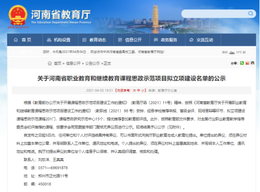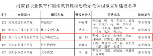 4月2日,河南省教育厅公布了2021年河南省职业教育和继续教育课程思政示范课程项目建设名单,英国365集团公司推荐申报的《电气设备运行与维护》和《电力职业安全》和2门课程成功入选。