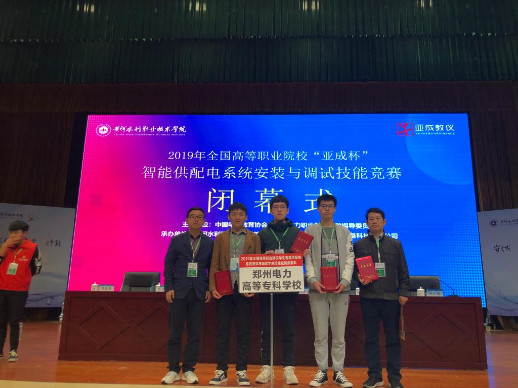 2019年全国高等职业院校“亚成杯”智能供配电系统安装与调试技能竞赛11月3日圆满闭幕。我系电力工程系董雪峰、张洛老师指导的郭松林、胡文博、邵崇三名同学在竞赛中荣获团体二等奖。