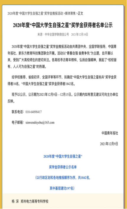 近日,共青团中央、全国学联公布了2020年度“中国老员工自强之星”奖学金获奖名单。公司2020级发电2002班杨深同学荣膺2020年度“中国老员工自强之星“荣誉称号。