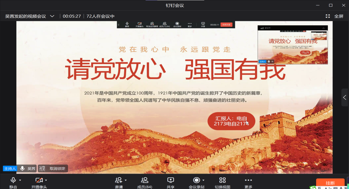 公司21个2021级新生团支部是第一次举行这样的活动,尤其是在防疫的大背景下通过线上进行,显得格外有意义。他们表示将尽快融入公司这个大家庭,以青春之我,以朝日之我,投入校园生活,沿着党开辟的道路,在追梦中鼓舞斗志、砥砺前行!