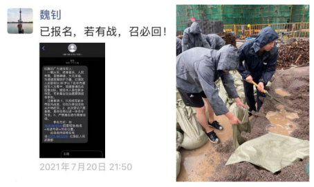 暴雨在这一天席卷郑州,早上市民们还在朋友圈调侃“只要心态好,郑州处处巴厘岛”。然而暴雨一致持续了近24个小时,下午城市水位不断上涨,内涝严重。在灾害发生的第一时间,发电1901班班长魏钊作为一名退伍士兵,立即投入到了家乡的抢险救灾工作中去。加入当地的退伍军人队伍中,装沙袋,填水渠,洪水不退人不退。无需多言,有战必回,有战必胜。