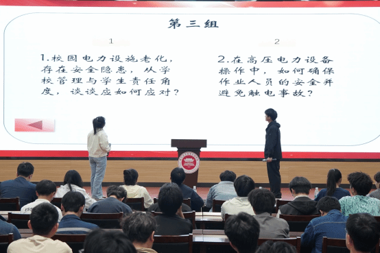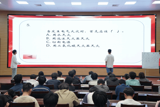 决赛环节围绕电力安全、宿舍安全、校园安全等多个关键领域的知识,以竞答形式展开激烈角逐。共分为三个环节:抢答环节,图片找茬环节和九宫格环节。抢答环节现场气氛紧张热烈,选手们迅速反应,抢到手牌者优先选择答题题目,冷静思考后清晰作答,另一位选手则立刻调整状态,专注等待作答余下题目。整个环节中,选手们专注投入,积极应对,体现出公司学子对安全知识的扎实掌握和良好的竞赛素养。